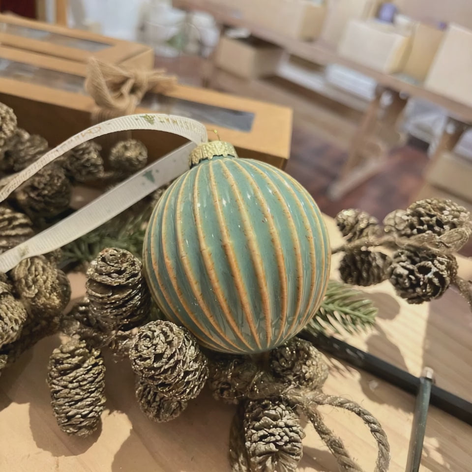 Dette er en smuk julekugle. Den er lavet af porcelæn og har en tidsløs grøn farve, med et brunt knæk over rillerne. Perfekt til at skabe en fornem og festlig stemning i julen. Bestil din julekugle i dag og glæd dig til at pynte op til jul! Håndlavet i hvid porcelæn med glasur. Alle ornamenter er håndlavet.