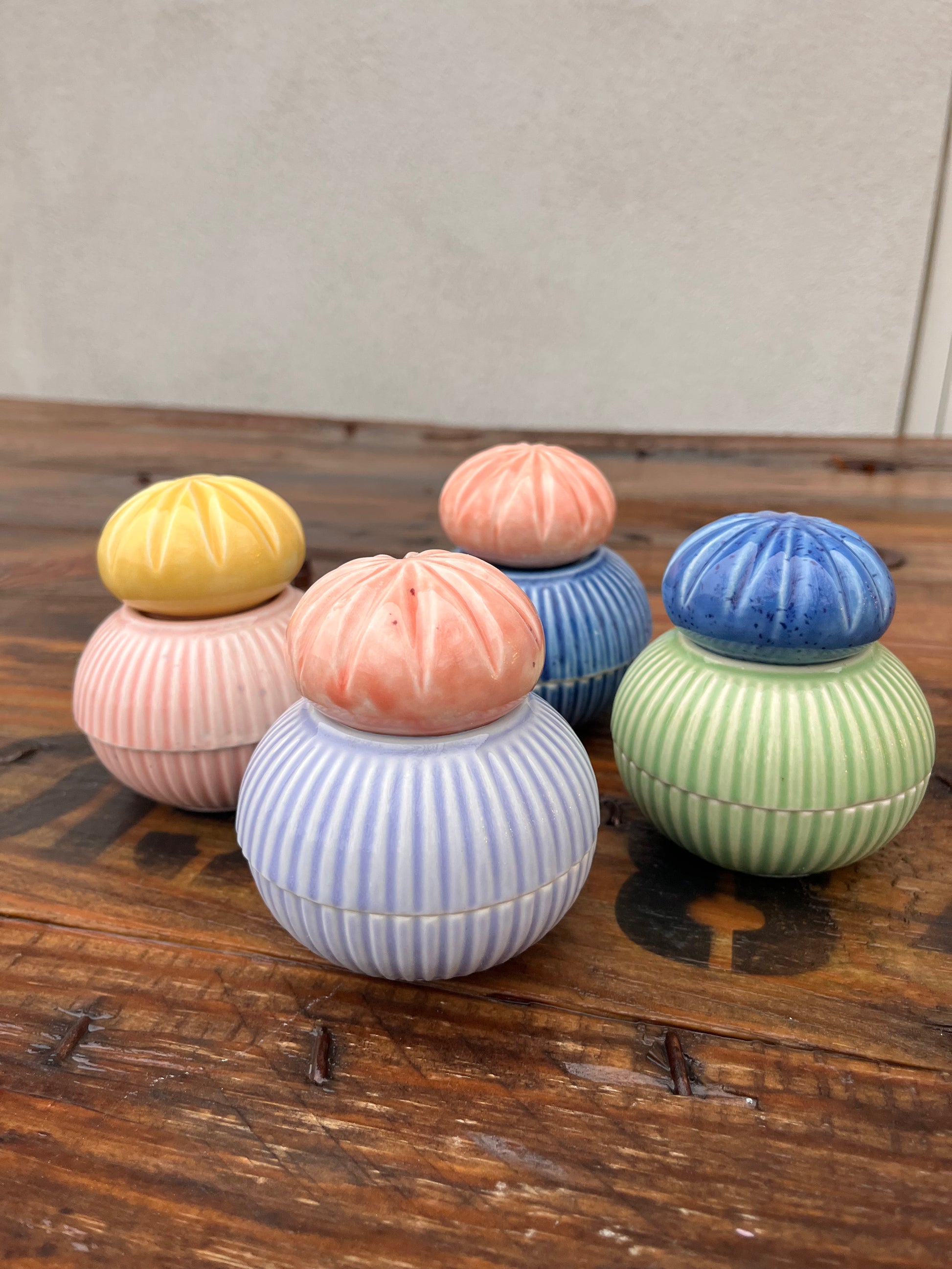 Hver eneste én er håndlavet i keramik, formet i hånden og glaseret i de fineste pasteller med et blødt, rillet udtryk. Toppen har en lille knop, der giver dem det dér legende, hyggelige og helt særlige udtryk, som jeg elsker.