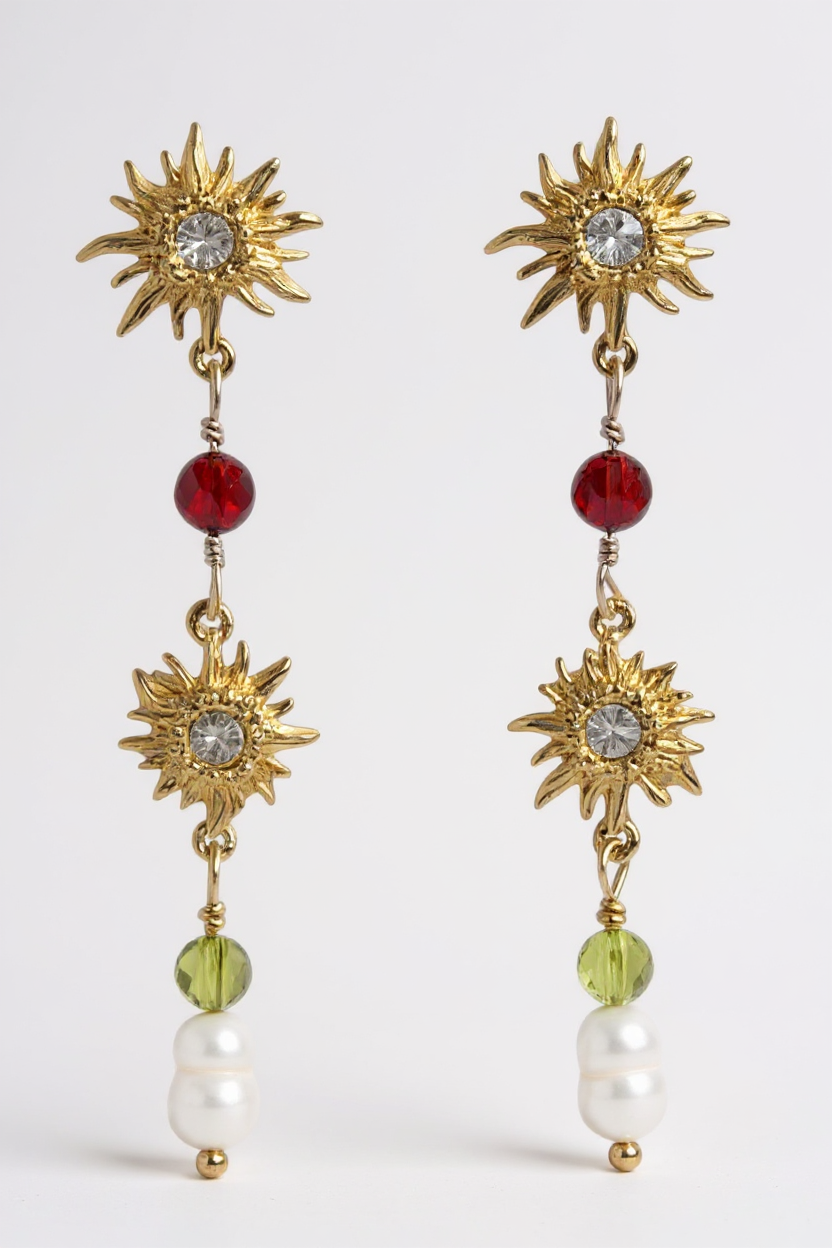 Sunset earrings in 925 sterling silver with 18k gold plating. Adorned with red and green crystal beads and white freshwater pearls for a radiant, colorful look. Ideal statement earrings for parties or everyday glam.